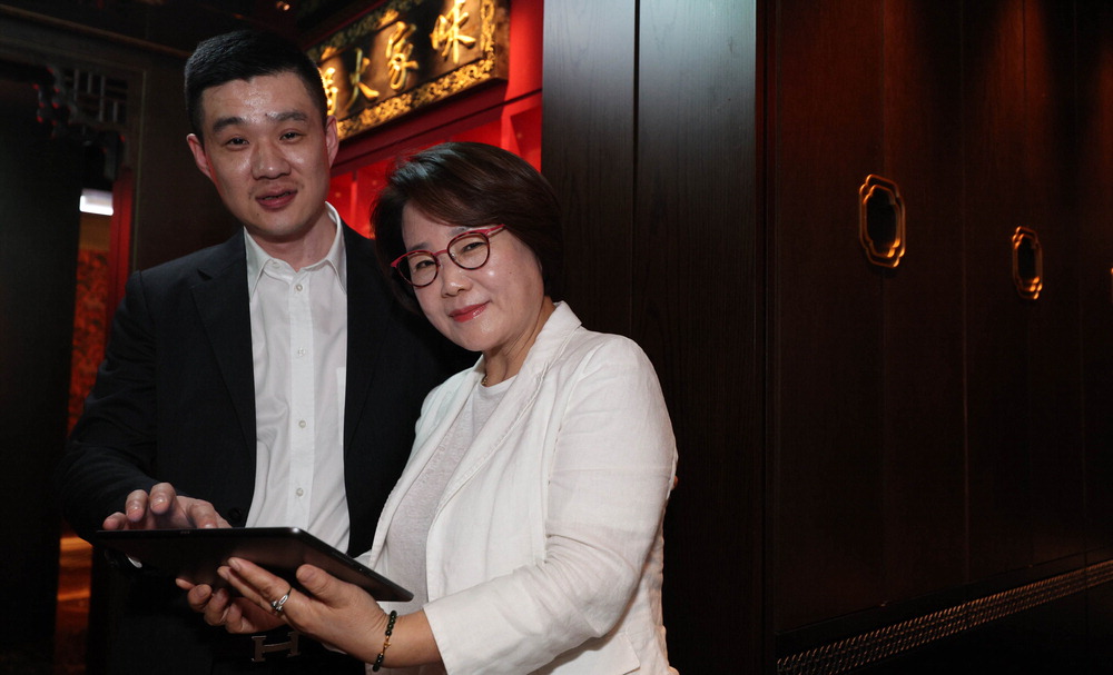 신세계백화점 강남점 '미가훠궈'에서 김미화 미가훠궈양고기 대표(오른쪽)와 아들인 장혜승 씨가 미가훠궈에 대해 설명하고 있다. 이충우 기자