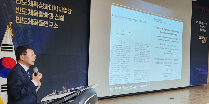 하엘이 자체개발한 ‘반도체 암진단 시스템’에 대해 설명하는 김준 대표 하엘(HAEL) 대표인 고려대학교 김준 교수가 15일 강원대에서 열린 ‘반도체 특성화대학사업단 개소식’에서 자체 개발한 ‘반도체 암진단 시스템’에 대해 설명하고 있다.