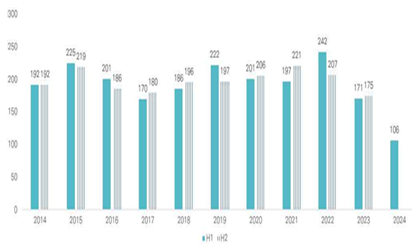 보고서에 따르면 올 상반기 글로벌 보험시장에서의 M&A 거래 건수는 106건으로 지난해 같은 기간(171건)보다 38% 줄었다. 2년 전인 2022년 상반기(242건)와 비교하면 56.2%나 급감했다.