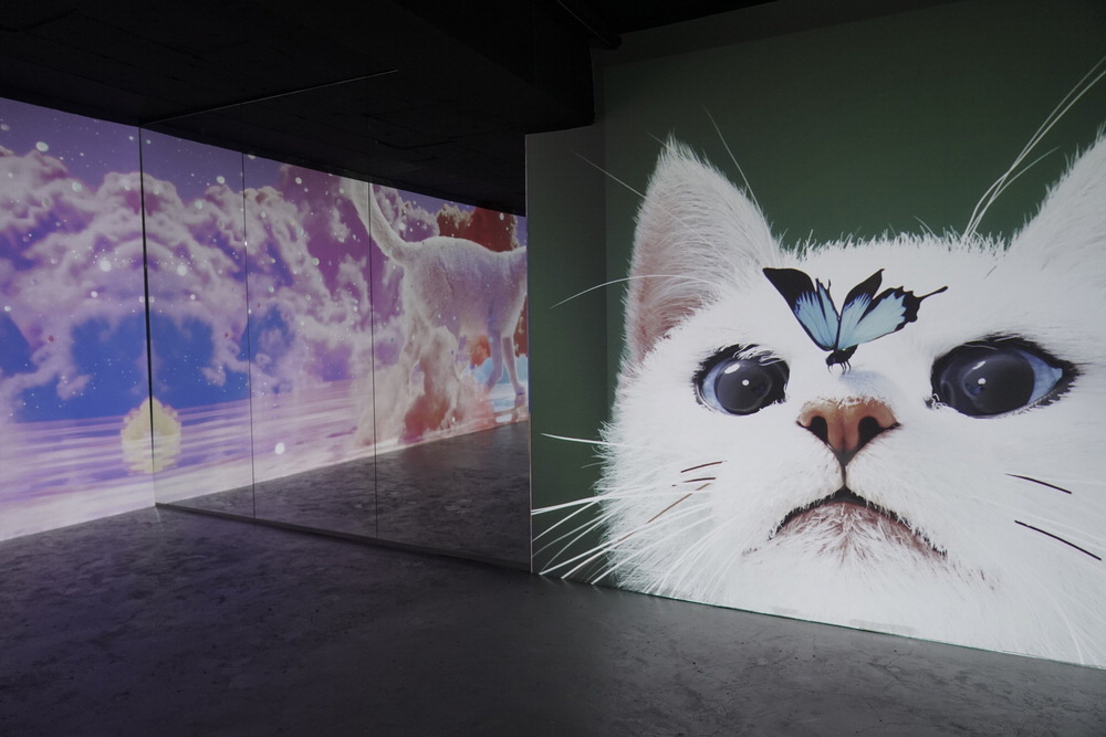 지난 20일 서울 서초구 양재동의 칼로스 아트 스페이스. 벽면을 가득 채운 대형 화면에 거대한 흰 고양이가 눈을 감고 살랑살랑 꼬리를 흔들고 있었다. 화면에서 고양이가 걷고 또 걷는 동안 주변엔 화려한 꽃이 피어오르기도 하고 나비도 날아다닌다. 털끝 하나까지 실물과 구분되지 않을 정도로 생생하게 표현된 이 고양이는 미디어아트그룹 '칼로스(KALLOS)'의 미디어아트 연작 '자이언트 캣(Giant Cat)'이다. 현실에서는 볼 수 없는 거대한 고양이의 움직임에 몰입해 시시각각 변하는 초현실적인 화면에 집중하다 보면 자연스레 관객은 시각적·정서적 즐거움을 얻게 된다.
