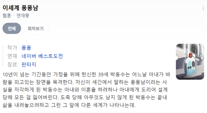 웹툰 ‘이세계 퐁퐁남’ 소개 내용. <네이버웹툰> 이세계 퐁퐁남은 부인에게 배신당하고,이혼으로 재산의 대부분을 빼앗긴 남자 주인공이 우연한 계기로 다른 세계로 건너가 활약하는 이야기를 다뤘다.