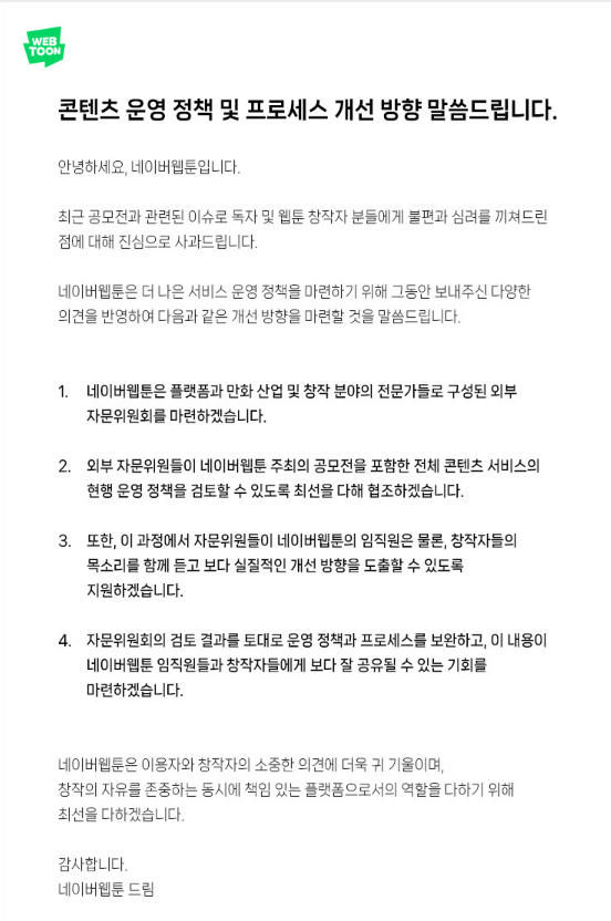 네이버웹툰 공지문. 이어 “플랫폼과 만화 산업 및 창작 분야 전문가들로 구성된 외부 자문위원회를 마련하겠다”며 “자문위원이 공모전을 포함한 전체 콘텐츠 서비스의 현행 운영 정책을 검토할 수 있도록 협조하겠다”고 말했다.
