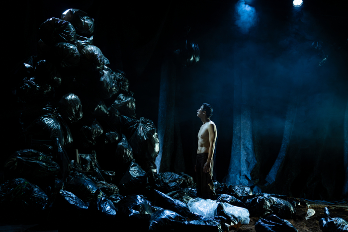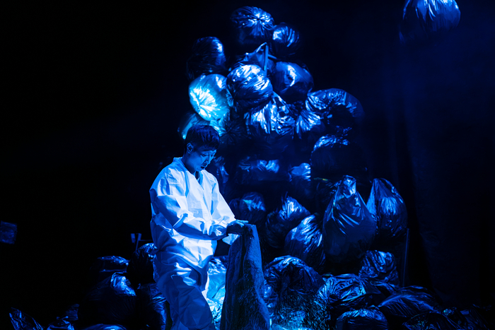 1인극 ‘붉은웃음’에서 유품 정리사가 고독사한 청년의 물품을 정리하는 모습. 김인준 연극은 유품 정리사가 검은 비닐봉지들을 정리하는 장면으로 시작된다. 무대 한켠에 비닐봉지가 산처럼 쌓여있고,방호복을 입은 정리사가 또 다른 비닐봉지들을 가져오는 장면이 긴 호흡으로 이어진다. 죽은 자의 유품이 계속 더해지는 모습은 애도되지 않는 죽음이 끊이지 않는다는 사실을 시각적으로 드러낸다.