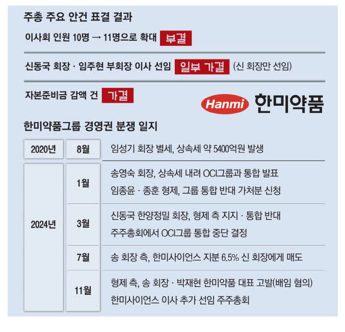 과반수의 동의만 요구되는 일반결의 안건인 신규 이사 선임 건과 세 번째 안건으로 상정된 자본준비금 감액 안건도 가결됐다. 이로써 기존에 3자 연합 측 4명,형제 측 5명으로 구성돼 있던 한미사이언스 이사회는 5대5 동률 구도가됐다. 3차 연합 측은 형제 우위의 이사회 구도를 6대5로 뒤집고 이사회를 장악한다는 복안으로 이번 주총을 열었지만 결국 반쪽짜리 승리에 만족해야 했다.