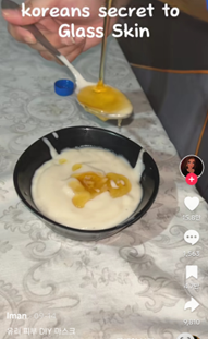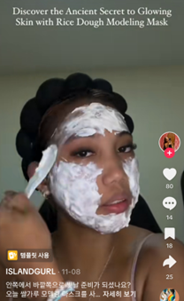 풀리 쌀반죽 모델링 마스크를 사용하는 모습 [사진=틱톡 캡쳐] “밥을 지은 뒤 약간의 물과 함께 믹서기에 넣어 갈아줘요. 냉장고에서 약 2주 정도 숙성시켜주면 완성입니다. 이게 한국인들의 빛나는 피부의 비결이에요.”