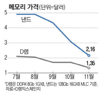 11월 범용 D램·낸드값 20%대 폭락
