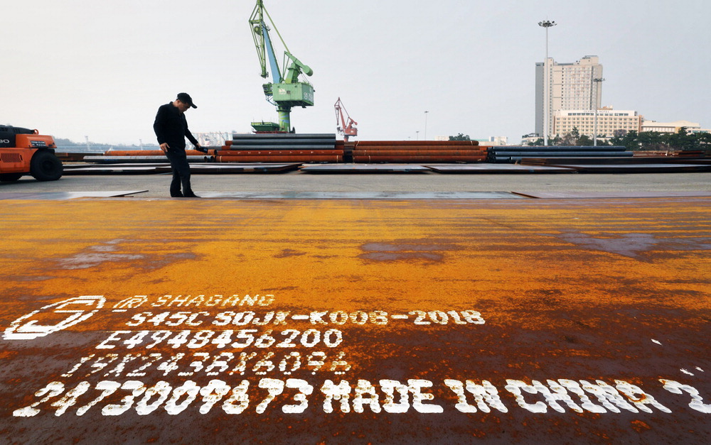 중국산 철강재 주요 수입로인 인천항에서 2일 한 물류 담당자가 '메이드 인 차이나(MADE IN CHINA)'라는 글귀가 적힌 중국산 후판을 살펴보고 있다. 이충우 기자
