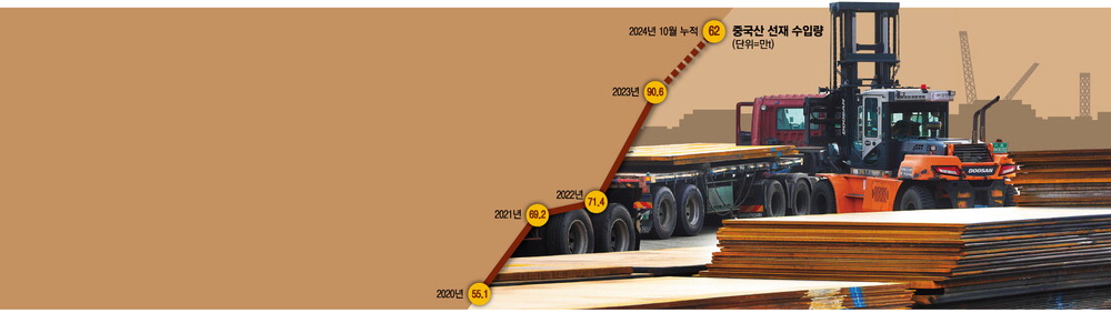 철강업계는 중국산 저가 철강재 유입에 따른 직격탄으로 해석한다. 한국철강협회에 따르면 중국산 후판 수입 물량은 2021년 47만t에서 지난해 131만t으로 2년 사이에 3배 가까이 급증한 것으로 나타났다. 올 들어 10월까지 수입 물량은 104만t으로 지난해와 비슷한 수준을 보일 것으로 전망된다. 중국산 선재 연 수입량은 지난해 약 91만t으로,2020년(55만t) 대비 65%나 늘었다. 올 들어 10월까지는 62만t으로 집계됐다.