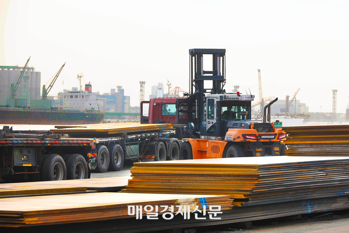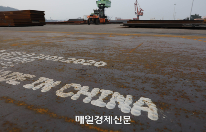 중국산 철강재의 주요 수입로인 인천항에서 2일 한 물류 담당자가 ‘메이드 인 차이나(MADE IN CHINA)’라는 글귀가 적힌 중국산 후판이 앃여있다. 이충우 기자 2024.12.02[이충우기자]