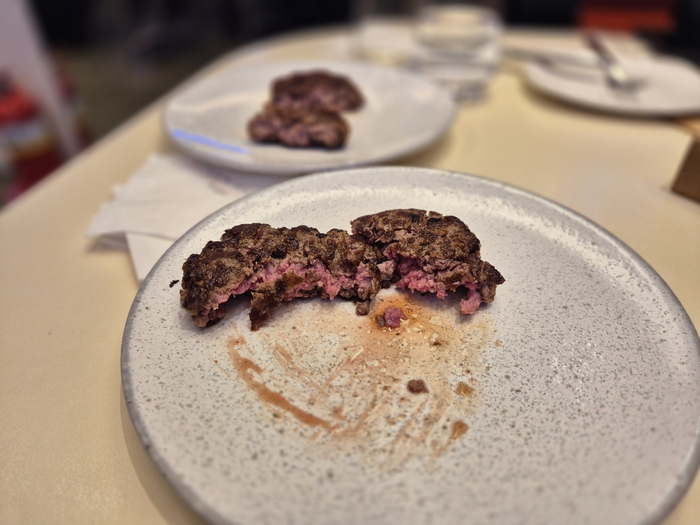 육즙을 살린 미디움 굽기의 패티.[사진=김현정 기자] 이 자리에서 박준현 고든램지버거 총괄쉐프는 고든램지 버거의 ‘패티’를 강조했다. 박준현 쉐프는 “미국산 등심 덧살과 양지 목심을 사용했으며,우지방을 넣는 다른 프랜차이즈와 달리 고기 자체의 기름만 섞어 들어가게 만들고 있다”고 말했다. 고기의 풍미와 원래 씹히는 맛을 충분히 살렸다는 설명이다.