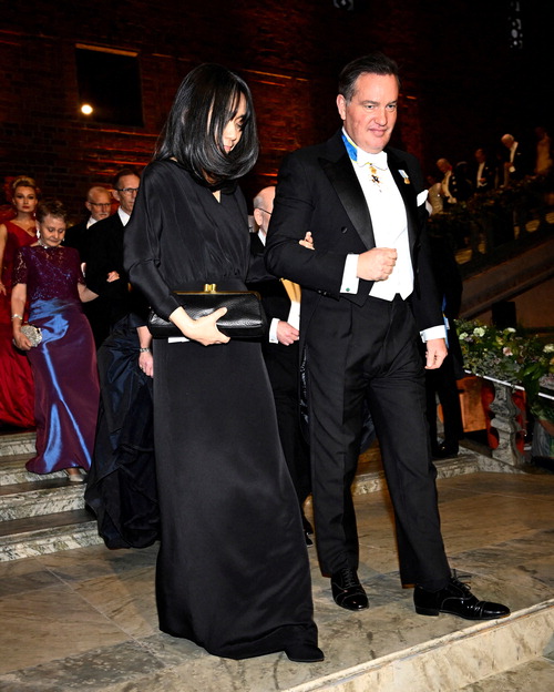 한강 작가가 마들렌 스웨덴 공주의 남편인 크리스토퍼 오닐(오른쪽)에게 에스코트를 받으며 연회장에 입장하고 있다. 로이터연합뉴스