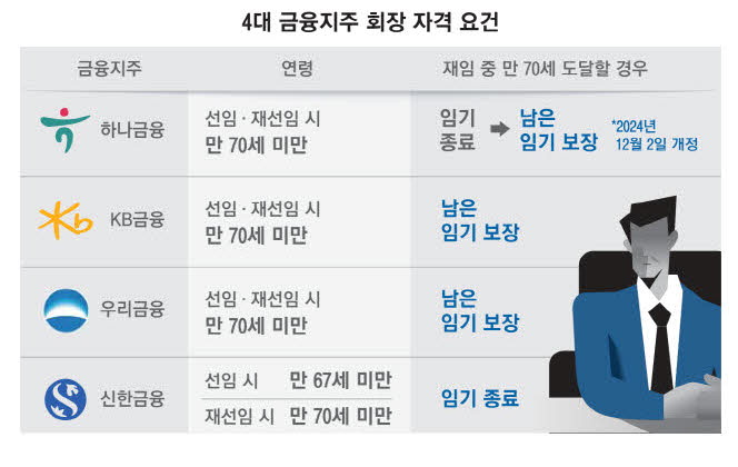 4대 금융지주 중 신한금융그룹은 만 70세가 되는 즉시 회장 임기가 종료된다. 반면 KB금융그룹과 우리금융그룹은 재임 중 만 70세가 돼도 남은 임기를 채울 수 있다. 하나금융도 이번 규범 개정으로 만 70세 여부와 관계없이 임기가 보장되는 구조로 바뀌었다.