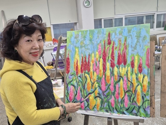 교수 출신 김순복 작가가 작업실에서 포즈를 취했다. 제공|김순복 작가 평생을 영문학 교수로 후학 양성에 힘써오다 화가로 변신한 김순복 작가가 첫 개인전을 연다.