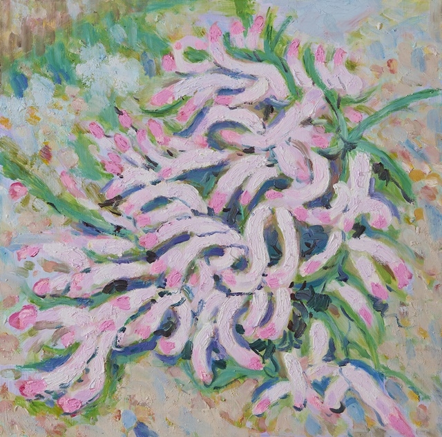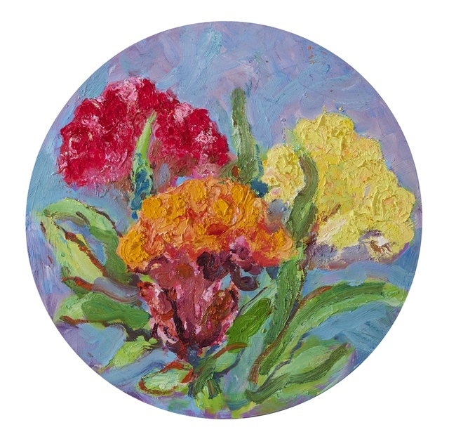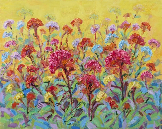 작가는 맨드라미 꽃의 생명력에 주목,역동적 붓 터치와 빨강 노랑 주황 등 강렬한 색채로 맨드라미 꽃을 캔버스에 담아냈다.