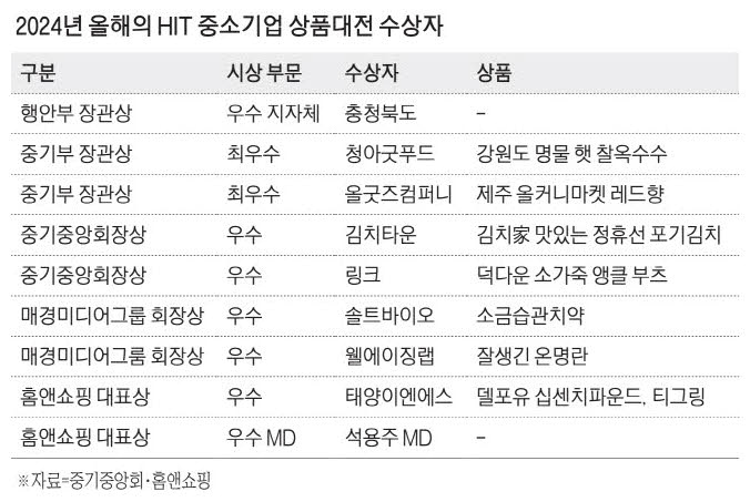 18일 서울 여의도 중기중앙회에서 열린 '2024년 올해의 HIT 중소기업 상품대전' 시상식은 홈앤쇼핑 일사천리 사업을 통해 높은 매출 실적을 올린 중소기업과 자기 지역 중소기업의 판로를 확대하기 위해 노력한 지자체 등을 축하하고 격려하는 자리였다.