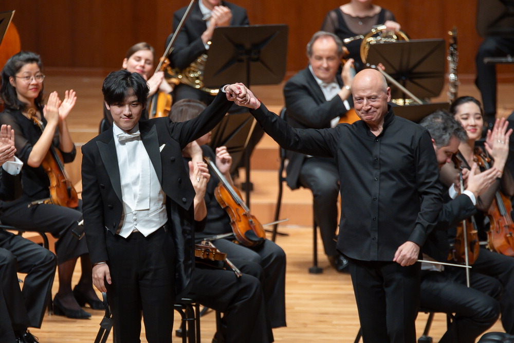 도이치 캄머필하모닉 내한 공연에서 인사하는 피아니스트 임윤찬과 지휘자 파보 예르비. 빈체로