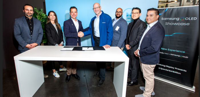 미국 샌프란시스코 돌비 본사에서 (왼쪽에서 세 번째) 돌비 래버러토리스 패트릭 로시 부사장과 (왼쪽에서 네 번째) 미주법인 디스플레이 영업담당 존 제이콥스 상무가 삼성디스플레이-돌비 래버러토리스 MOU 체결식을 진행하고 있다. [사진제공=삼성디스플레이] 삼성디스플레이가 미국 오디오 관련 기업 ‘돌비 래버러토리스(Dolby Laboratories)’와 손 잡는다. 삼성디스플레이는 돌비의 프리미엄 HDR 영상 기술인 ‘돌비 비전’을 기반으로 한 차량용 OLED를 공동 프로모션하기 위한 양해각서(MOU)를 맺었다고 19일 밝혔다. 삼성디스플레이는 “삼성디스플레이의 차량용 OLED와 돌비 비전의 프리미엄 HDR 영상 기술이 만나 시너지를 발휘할 것”이라며 “차량 내 엔터테인먼트 경험을 새로운 차원으로 끌어올릴 것으로 기대된다”고 밝혔다.