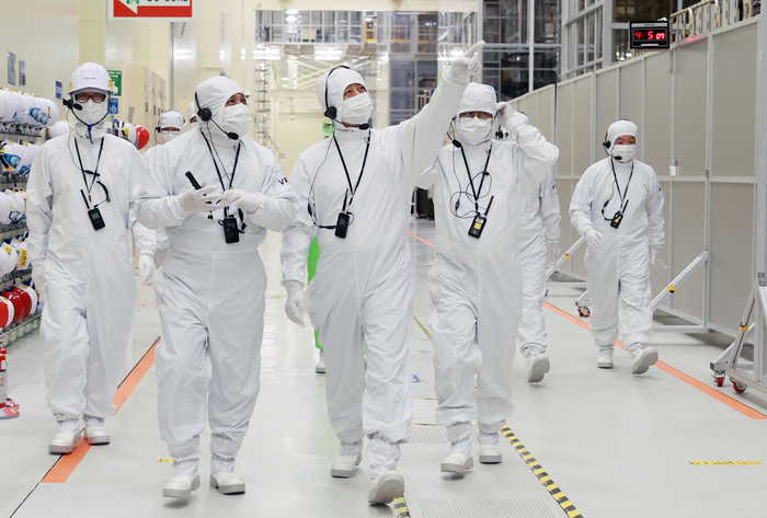 안덕근 산업통상자원부 장관이 20일 충남 아산시 삼성디스플레이 아산공장을 방문해 유기발광다이오드(OLED) 수출을 지속 확대하기 위한 정책 방향 등을 논의했다. 이날 안 장관(왼쪽 세번쨰)이 OLED 패널 제조현장을 둘러보고 있다. <사진=산업통상자원부>