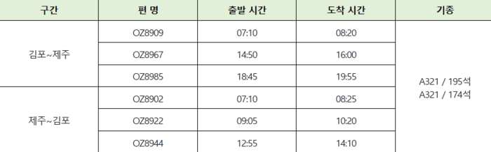 김포 출발 시각은 오전 7시 10분,오후 2시 50분,오후 6시 45분이고 제주 출발 시각은 오전 7시 10분,오전 9시 5분,정오 55분이다. 항공기 투입 기종은 A321로 비즈니스·이코노미석 174석과 이코노미석 195석으로 구성한다.