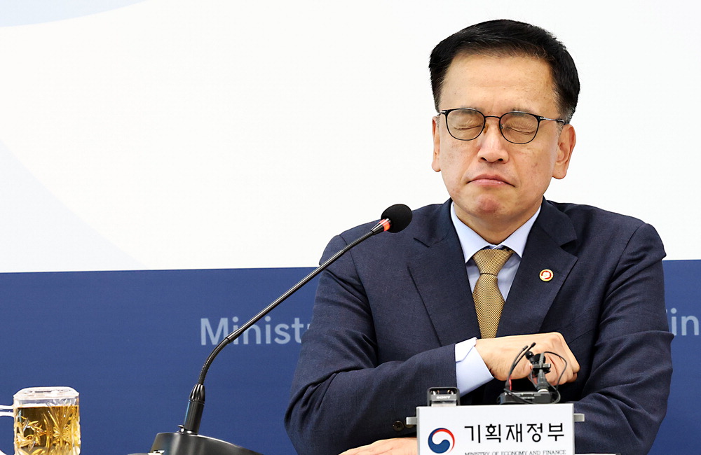 고민에 잠긴 경제부총리 최상목 경제부총리 겸 기획재정부 장관이 23일 정부세종청사에서 열린 출입기자단 간담회에서 기자들의 질문을 들으며 눈을 질끈 감고 있다. 이날 최 부총리는 복지·인프라 등 시급한 분야에 내년 예산을 조기 집행하겠다는 입장을 밝혔다. 뉴스1