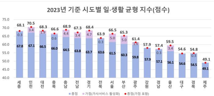 25일 고용노동부(고용부)에 따르면 2023년 고용부가 전국 17개 광역시도의 일·생활 균형 지수를 조사한 결과 세종,인천,대전 순으로 높게 나타났다.