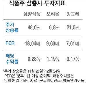 식품주 가운데 눈에 띄는 것은 삼양식품이다. 이 회사는 마진도 높고 성장 속도도 빠르지만 현재 주가가 가장 비싼 것이 흠이다. 오리온은 식품을 넘어 바이오 사업으로 확장한 것이 주가가 상대적으로 덜 오르고 있는 근거로 작용한다. 빙그레는 지배구조 개편 과정에서 개인투자자들이 홀대받는 것 아니냐는 리스크가 두드러진다.