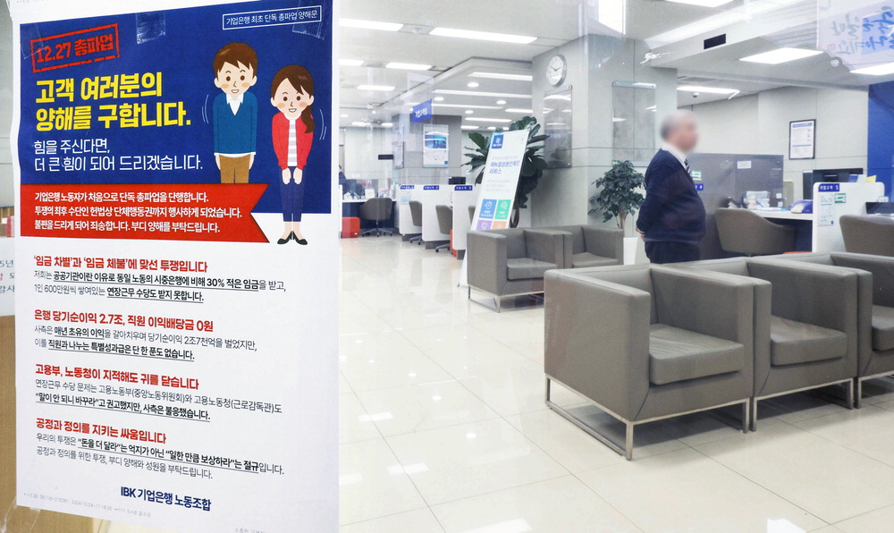 IBK기업은행 노조가 27일 임금 인상을 요구하며 첫 단독 총파업에 나섰다. 기업은행에 따르면 이날 전체 조합원의 절반가량이 파업에 동참했다. 노조가 2·3차 총파업도 고려하겠다는 입장이란 점을 고려하면 창구 업무의 지속적인 차질이 우려된다. 이날 서울 중구의 기업은행 영업점에 파업을 알리는 안내문이 붙어 있다. 이충우 기자