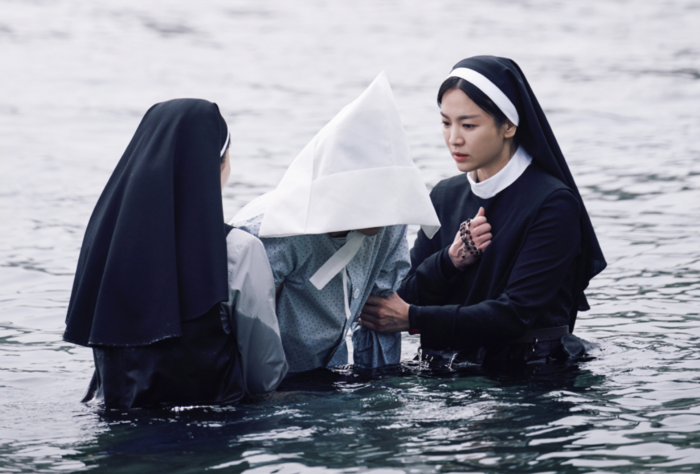 영화 ‘검은 수녀들’ 한 장면. 다음달 24일 개봉하는 ‘검은 수녀들’에서 송혜교는 ‘구마 수녀’ 역을 맡았다. 장재현 감독의 오컬트 3부작 중 첫 번째 작품인 ‘검은 사제들’의 세계관을 공유하는 이번 영화 ‘검은 수녀들’에서 송혜교는 십자가가 새겨진 수녀복을 입고 악령을 쫓는 유니아 수녀 역을 맡았다.