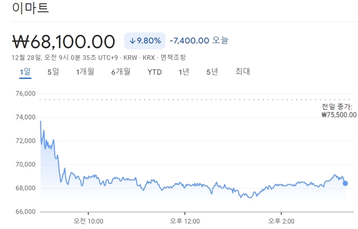12월27일 이마트 주가 추이(자료=구글파이낸스) “이마트가 G마켓을 중국과의 합작회사로 떼내면 중국 회사로 매각하고 국내 소비자 정보도 알리에 다 넘어가는 것 아닙니까”. 최근 신세계그룹이 중국 알리바바와 전략적 동맹을 맺겠다는 소식에 투자자들의 우려감도 커지고 있다. 이같은 발표 이후 신세계그룹의 주력 자회사 이마트 주가가 폭락한 것이 이를 대변한다는 것이다.