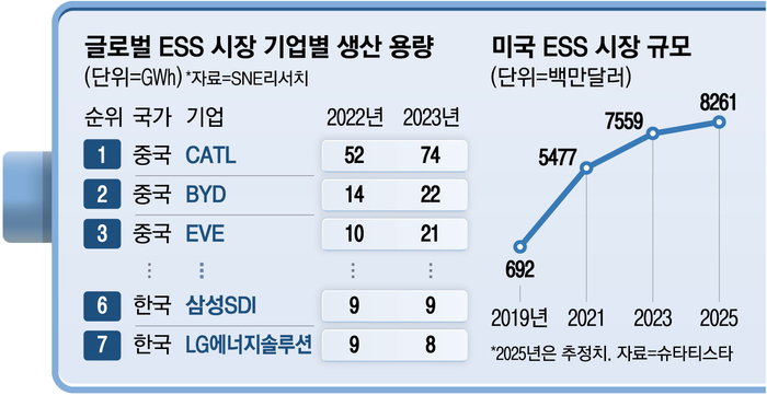 반면 한국 배터리 기업들이 기술 우위를 점한 삼원계 니켈·코발트·망간(NCM) 배터리는 에너지 밀도가 높고 충전 성능이 좋아 전기차 배터리로는 적합하지만 ESS 시장에선 외면받고 있다.