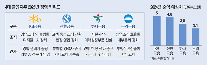 한편 금융정보업체 에프앤가이드에 따르면 4대 금융지주(KB·신한·하나·우리)의 지난해 연간 순이익 전망치는 총 16조9245억원으로 17조원에 육박할 전망이다. 이는 2022년 고금리 상황에서 거둔 사상 최대 실적(15조6503억원)을 웃도는 규모다.