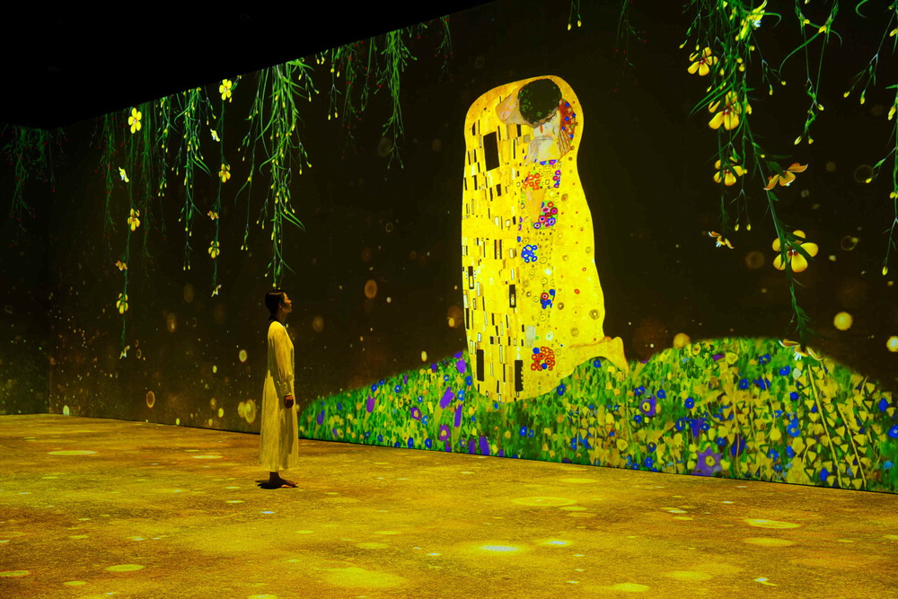 '구스타프 클림트: 타임리스 뷰티' 전시가 열리고 있는 서울 중구 그라운드시소 명동 전시장에 클림트의 대표작 '키스'(1908)가 미디어 아트로 펼쳐지고 있다. 미디어앤아트