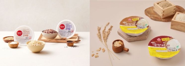 CJ제일제당의 ‘햇반 곤약밥’(왼쪽)과 오뚜기의 ‘수향미 현미밥’. [사진 = CJ 제일제당 제공] 탄수화물을 낮춘 즉석밥도 인기를 끌고 있다.