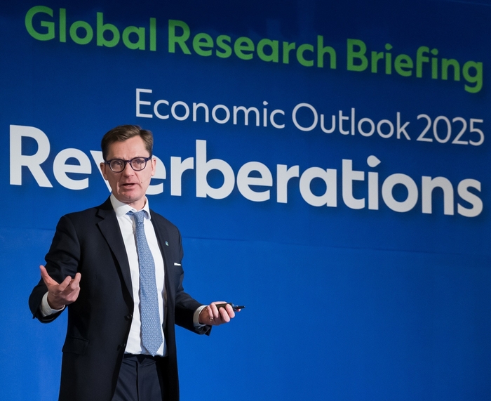 지난 10일 서울 종로구 포시즌스호텔에서 열린 ‘2025 글로벌 리서치 브리핑’ 행사에서 에릭 로버트슨(Eric Robertsen) SC그룹 글로벌 리서치 헤드가 글로벌 거시 투자전략에 대해 강연하고 있다. [사진 = SC제일은행] SC제일은행은 모기업인 스탠다드차타드(SC)그룹의 경제전문가들과 함께 ‘2025 글로벌 리서치 브리핑’ 행사를 개최했다고 13일 밝혔다.