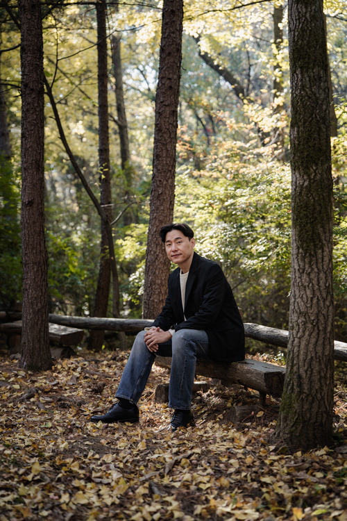 소설 '급류'의 정대건 작가가 공원 벤치에 앉아 카메라를 바라보고 있다. 한정선 작가