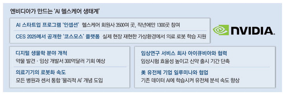 AI 반도체 선두 주자인 엔비디아가 JP모건 헬스케어 콘퍼런스 현장에 등장했다. 이 회사는 임상 연구,유전체 분석,디지털 병리학 등 다방면에 걸쳐 헬스케어 기업들과 잇달아 전략적 제휴를 맺으며 의료 산업에 대한 영향력 확대에 나섰다.