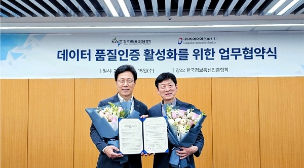 데이터 품질인증기관 씨에이에스(대표 전영하)는 한국정보통신진흥협회(회장 유영상,이하 ‘KAIT’)와 1월 15일 수요일,KAIT 사옥에서 주요 관계자들이 참석한 가운데 데이터 품질인증 활성화를 위한 업무 협약(MOU)을 체결하였다.