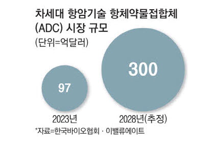 ADC는 항체(antibody)와 약물(drug)을 중심으로,이 둘을 연결하는 링커(linker)로 구성된 복합체다. 여기서 항체가 특정 암세포를 표적으로 삼아 집중 공격한다. 한국바이오협회와 이밸류에이트에 따르면 2023년 97억달러 규모였던 ADC 시장은 2028년 300억달러로 급성장할 전망이다.