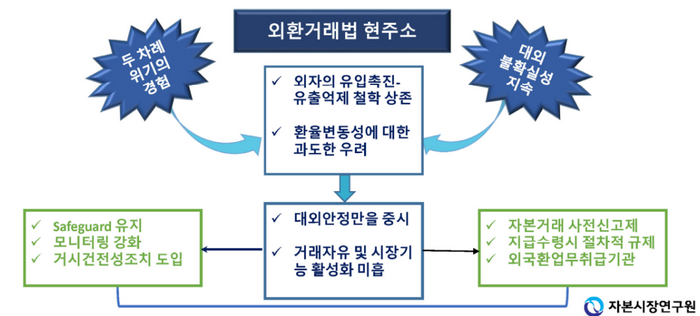 이승호 자본시장연구원 선임연구원은 “우리나라는 지난 25년간 외환위기 및 글로벌 금융위기 여파로 환율변동에 대한 트라우마가 지속되면서 외환부문의 위기대응역량 강화에만 치중해왔다”며 “그 결과,위기대응능력은 과거보다 개선됐지만 시장경제 활성화와 금융선진화를 통한 국격 제고에는 미흡하다”고 진단했다.
