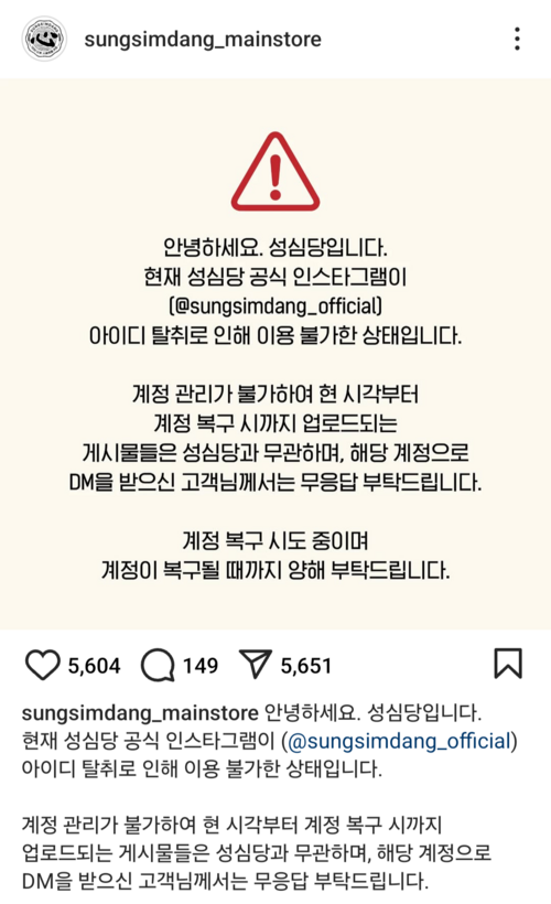 성심당은 지난 17일 “공식 인스타그램 계정이 아이디 탈취로 인해 이용이 불가한 상태”라며 “계정 관리가 불가해 현 시각부터 계정 복구 시까지 업로드되는 게시물들은 성심당과 무관하며 해당 계정으로 메시지를 받은 고객은 무응답을 부탁드린다”고 당부했다.