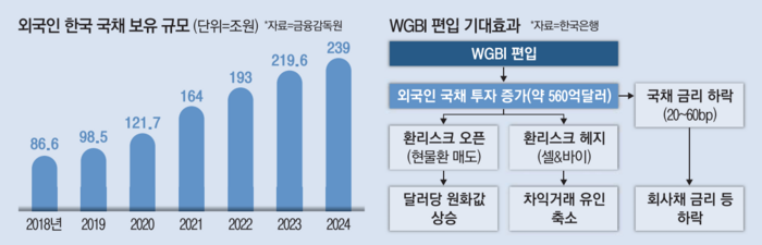 WGBI에 공식 편입되면 11월부터 1년간 560억~670억달러의 외국인 국채 투자 자금이 유입될 것이라는 전망이 나온다. 분기별로 외국인 자금 유입은 19조~22조원 규모로 추정된다.