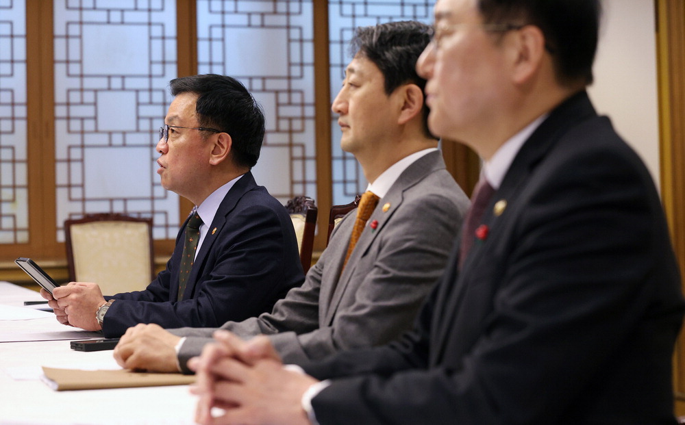 최상목 대통령 권한대행 부총리 겸 기획재정부 장관이 21일 대외경제현안 간담회에서 발언하고 있다. 왼쪽부터 최 권한대행,안덕근 산업부 장관,정인교 통상교섭본부장. 이승환기자