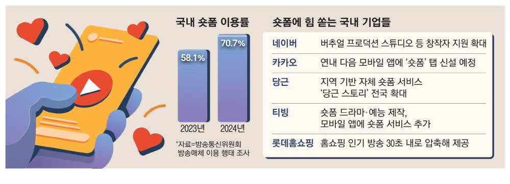 업계 구분 없이 이처럼 숏폼 서비스에 뛰어드는 배경에는 그만큼 숏폼이 이용자 붙잡기에 효과적이기 때문이다. 매출 증대 효과도 크다. 롯데홈쇼핑 관계자는 "고객 체류 시간이나 구매 전환율을 높이는 데 효과를 보고 있다"고 설명했다. 한국인들의 숏폼 사랑은 갈수록 커지고 있다. 방송통신위원회에 따르면 국내 숏폼 이용률은 2023년 58.1%에서 2024년 70.7%로 12.6%포인트 상승했다.