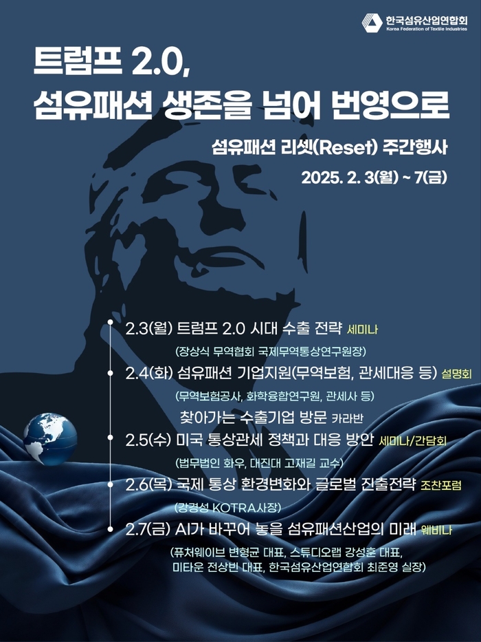 섬유패션 리셋(Reset)주간 한국섬유산업연합회(회장 최병오,이하 섬산련)가 내달 3일부터 7일까지 5일간 섬유센터 2층 Tex+Fa 라운지에서 ‘트럼프 2기 대응,섬유패션 리셋(Reset)주간 행사’를 개최한다고 22일 밝혔다.