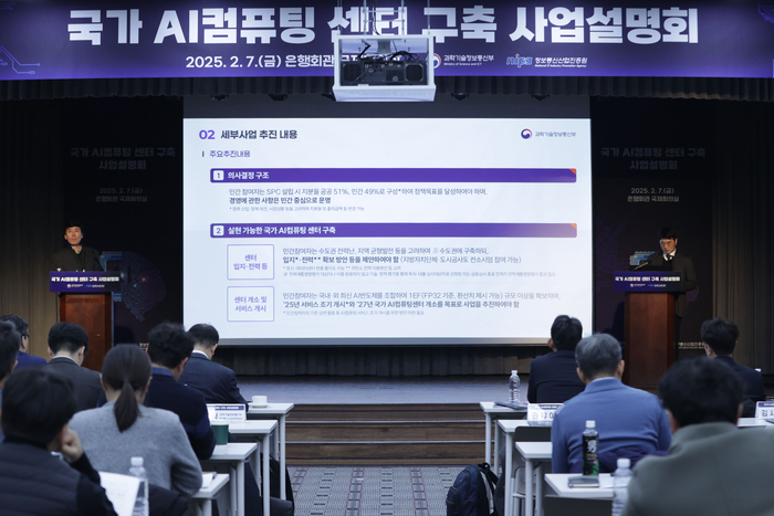 7일 서울 중구 은행회관에서 ‘국가 AI컴퓨팅 센터 구축 사업설명회’가 열리고 있다. [사진 = 연합뉴스] 과학기술정보통신부(이하 과기정통부)는 ‘국가 AI컴퓨팅 센터’ 구축 사업설명회를 7일 개최했다.