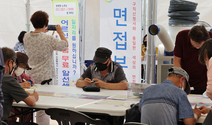 노인일자리채용상담장을 찾은 시니어들이 채용 상담을 기다리는 모습. [매경DB] 조동철 한국개발연구원(KDI) 원장이 “한국 노동시장에서 고령층은 임금이 생산성을 초과하고 있고,청년층은 그 반대 상황을 겪고 있다”며 “기업 입장에서 보면 고령층 해고가 더 매력적일 것”이라고 밝혔다.