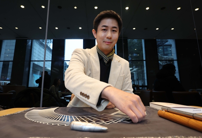 타로마스터 정회도가 최근 매일경제신문을 방문해 타로카드를 뽑아들고 있다. [한주형기자]