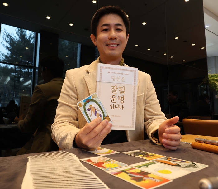 타로마스터 정회도가 최근 매일경제신문을 방문해 신간 ‘잘될 운명입니다’를 설명하고 있다. [한주형기자]