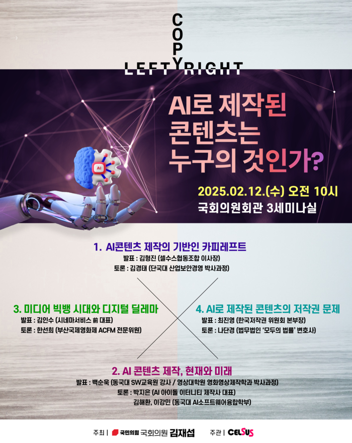 셀수스협동조합은 지난 12일 국회 의원회관 3세미나실에서 ‘AI로 제작된 콘텐츠는 누구의 것인가’ 라는 주제로 토론회를 개최했다.