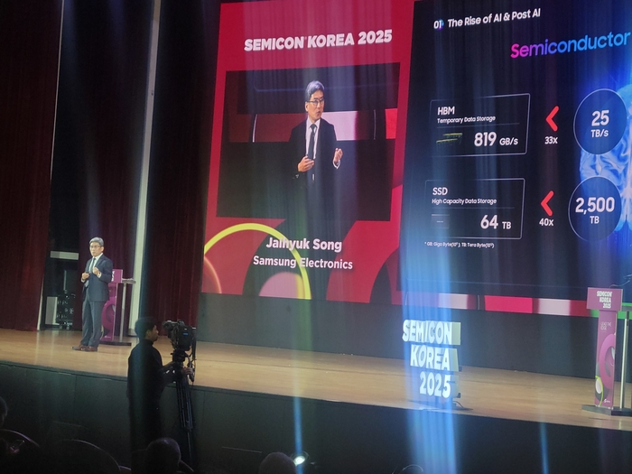 삼성전자 송재혁 최고기술책임자(CTO) 사장이 19일 ‘세미콘 코리아’에서 기조연설을 통해 반도체 기술의 미래와 인공지능(AI) 시대의 변화를 전망했다. 삼성전자 송재혁 최고기술책임자(CTO) 사장이 19일 ‘세미콘 코리아’에서 기조연설을 통해 반도체 기술이 고대역 고용량 저전력을 해결할 수 있는 유니버설 테크놀로지에 달려있다고 강조했다.